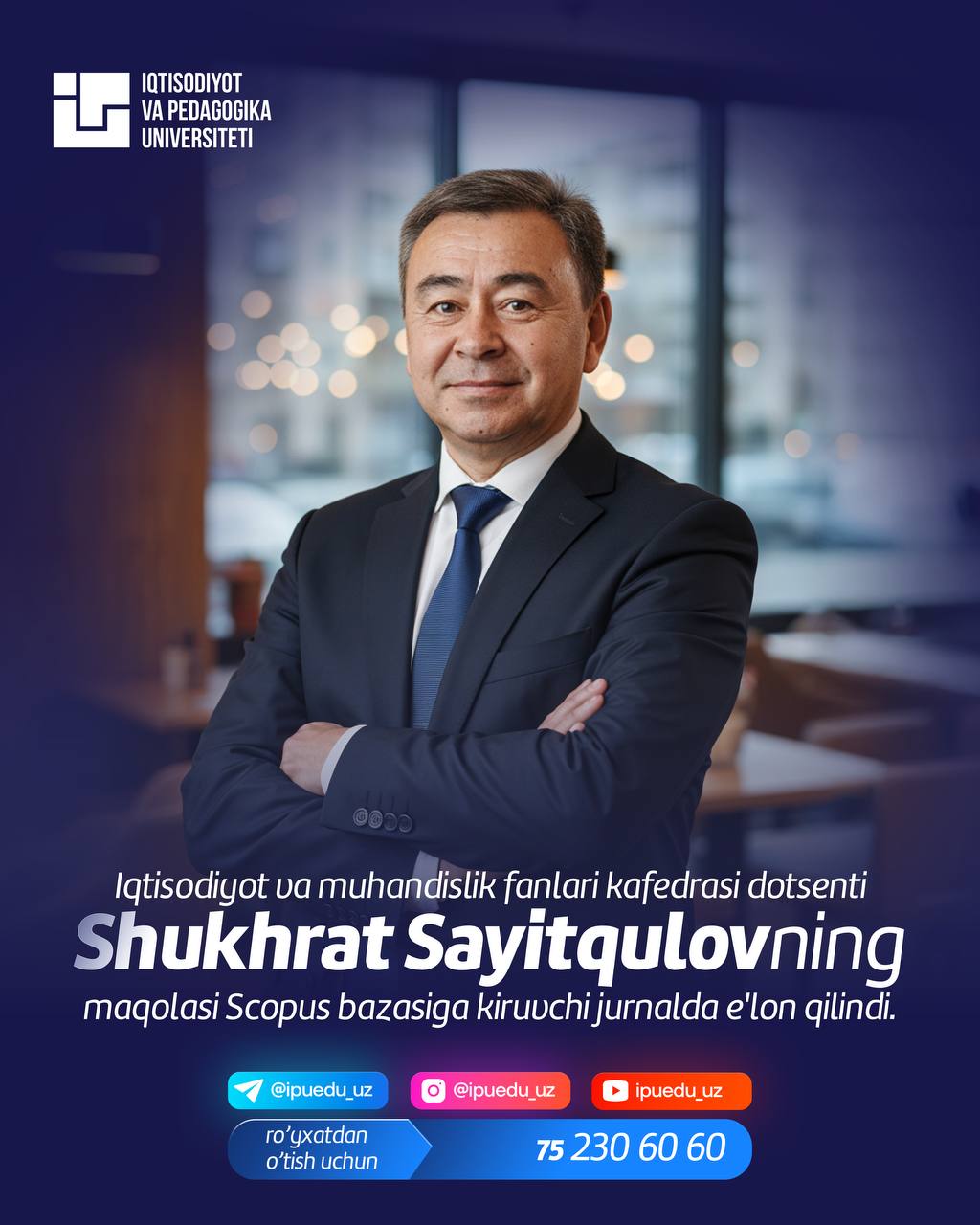 Iqtisodiyot va muhandislik fanlari kafedrasi dotsenti Shukhrat Sayitqulovning maqolasi Scopus bazasiga kiruvchi jurnalda e'lon qilindi.