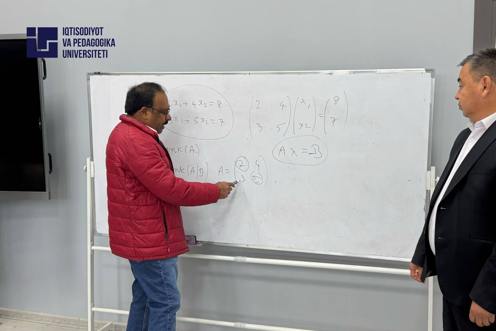 Iqtisodiyot va Pedagogika Universiteti Samarqand kampusining Iqtisodiyot va muhandislik fanlari kafedrasida Hindistonlik professor, fizika-matematika fanlari doktori K.K.Vishvanatan tomonidan “Amaliy matematika” fanidan 1-kurs Iqtisodiyot yo‘nalishi talabalari uchun ma’ruza mashg‘uloti o‘tkazildi.